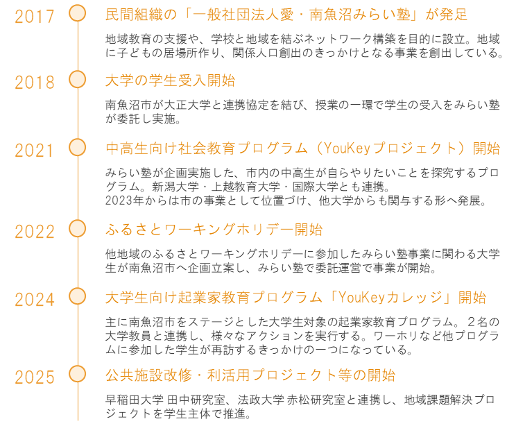 このような自治体と民間組織が連携し、関係構築を重ねてきた接点があったことで、みらい塾が担ってきた社会教育プログラムを、市の事業として展開していく流れへとつながっています。