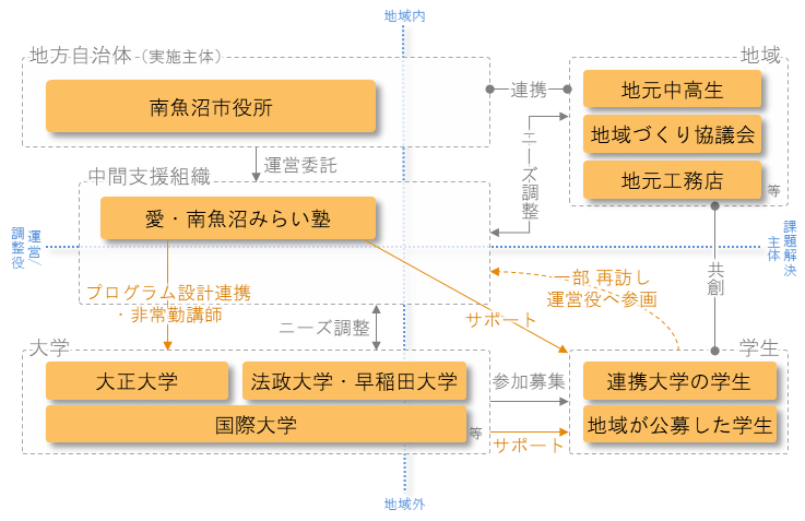 南魚沼市では、地域の民間組織(中間支援組織)である愛・南魚沼みらい塾が各種プログラムの運営を担い、自治体は資金面などで支援しながら連携する体制をとっています。愛・南魚沼みらい塾は、地域教育を支援する民間組織として、行政の立場でまちづくりに関わってきた小林氏と、教育現場に携わってきた倉田氏によって、学校と地域をつなぐネットワークの構築を目的に設立されました。