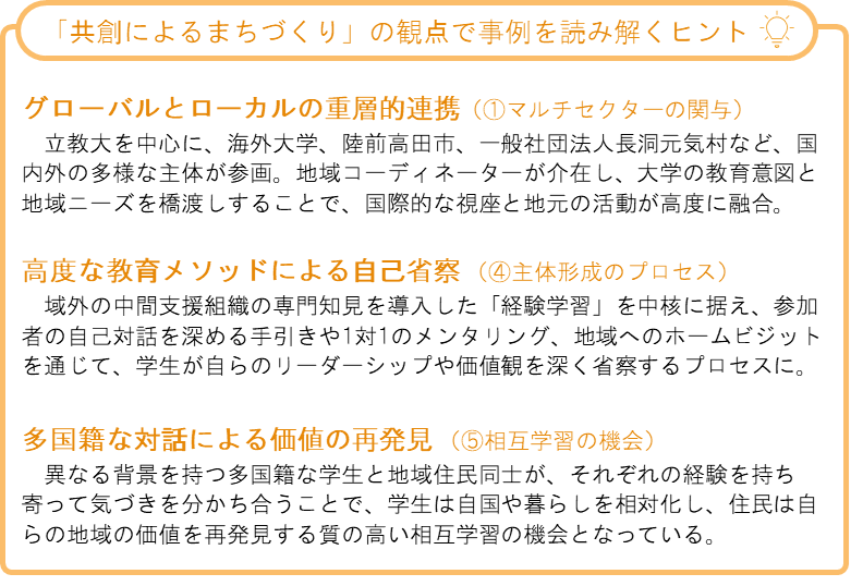 各事例のポイントを、「共創まちづくり」の観点から“読み解くヒント”としてまとめました。