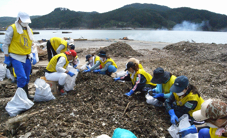 ▲ 震災直後の立教大学による支援ボランティア(左)