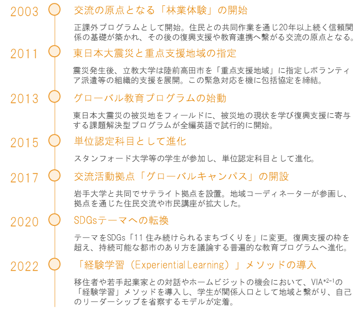 「陸前高田プロジェクト」は、立教大学が単位認定科目として継続してきた課題解決型の学びの一つです。もともとは被災地である陸前高田をフィールドに、復興にどう貢献できるかを考えることから始まりましたが、現在は「SDGs 11:住み続けられるまちづくりを」を共通テーマに掲げ、地方都市の持続可能性を広く問い直すプログラムへと発展しています。