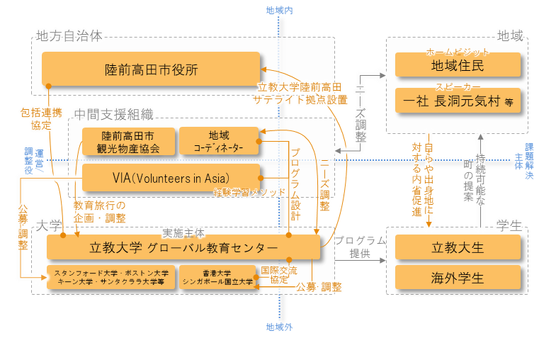 2. コーディネート体制:運営面では、陸前高田市において大学等との連携活動を主導する地域コーディネーターが、大学側の教育意図を踏まえながら、地域スピーカーや訪問先の調整を担っています。また、全体のコーディネートは立教大学グローバル教育センター客員准教授の髙井明子氏が、教育面のコーディネートは兼任講師であるVIAのYuki Ueda氏が担当し、それぞれが中間支援の役割を分担することで、無理のない運営体制が整えられています。