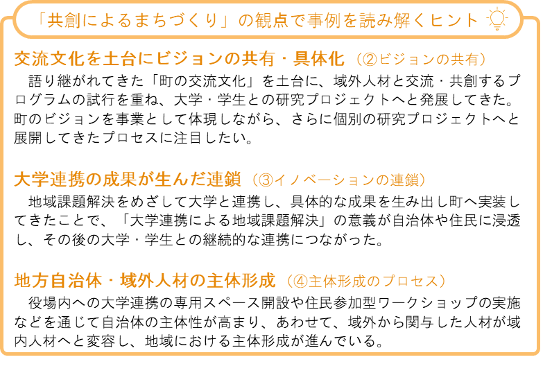 各事例のポイントを、「共創まちづくり」の観点から“読み解くヒント”としてまとめました。