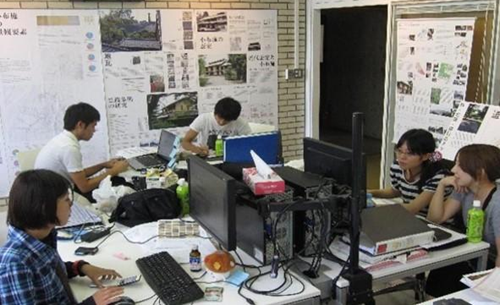 ▲ 東京理科大学の学生が役場内で作業する様子(左)