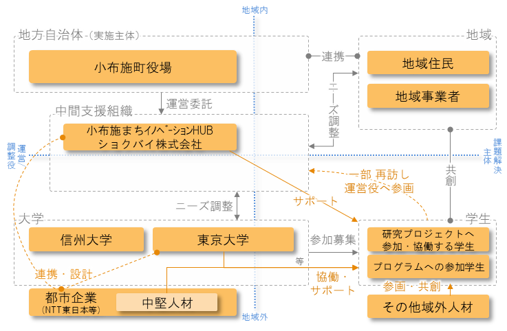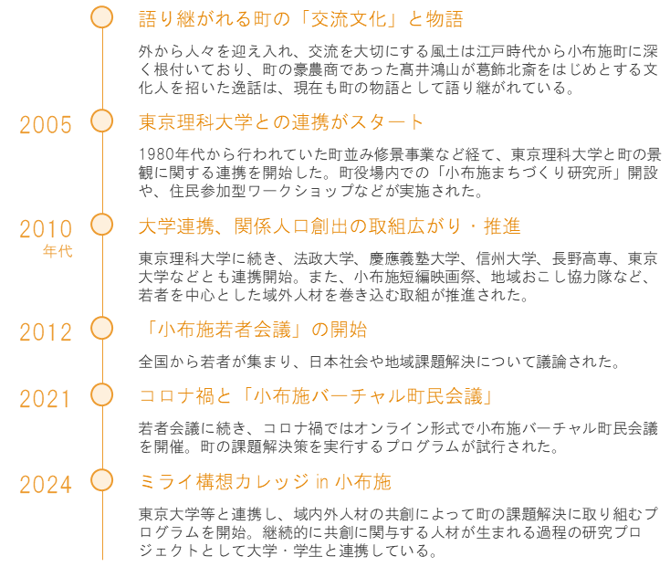 小布施町では、2005年に始まった東京理科大学との連携を皮切りに、自治体が主体性をもって大学連携を進める受入基盤を培ってきました。国道403号整備や「森の駐車場」の整備など、実装を伴う成果を積み重ねるなかで、大学連携を通じて地域課題を解決していくという意識が、地域側にも徐々に醸成されてきました。 また、小布施若者会議や小布施バーチャル町民会議を通じて、域外人材との交流の文化を継承され、こうした取組は2024年に「ミライ構想カレッジ in 小布施」へと発展しています。交流の取組においては、域外人材が担い手として地域に定着・循環する体制が築かれ、地域コーディネーターとファシリテーターの役割分担によって共創が推進されています。さらに、東京大学等との連携を通じて、関与を継続する人材を「共創人口」と定義し、その創出プロセスを研究ながら、プログラムとしての実装につなげています。 |