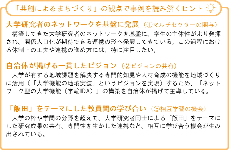 各事例のポイントを、「共創まちづくり」の観点から“読み解くヒント”としてまとめました。