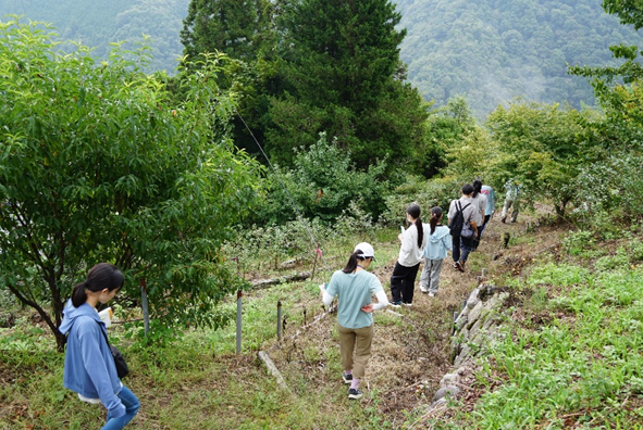 ▲ 遠山郷地域で行われた共通カリキュラムフィールドスタディの現地調査で急傾斜の農地を歩く学生