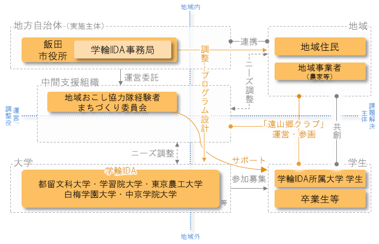 さらに2025年度には、学輪IIDAに関与する大学の学生組織「遠山郷クラブ」が設立されました。これにより、学生が地域住民と直接つながって主体的に地域課題の解決に関わるとともに、受入自治体と相互に、継続的な関係性を築こうとしています。 自治体は市役所内に大学誘致連携推進室を設置して大学連携の窓口を一元化し、地域や庁内との調整機能を担っています。また、地域おこし協力隊経験者などをコーディネーターとして配置し、学生と地域が対話を重ねながら活動内容を決められる土台を整備してきました。こうした取組により、フィールドワーク参加学生や卒業生が継続的に関わりやすい仕組みを構築し、関係人口の創出とネットワーク形成をめざしています。 |