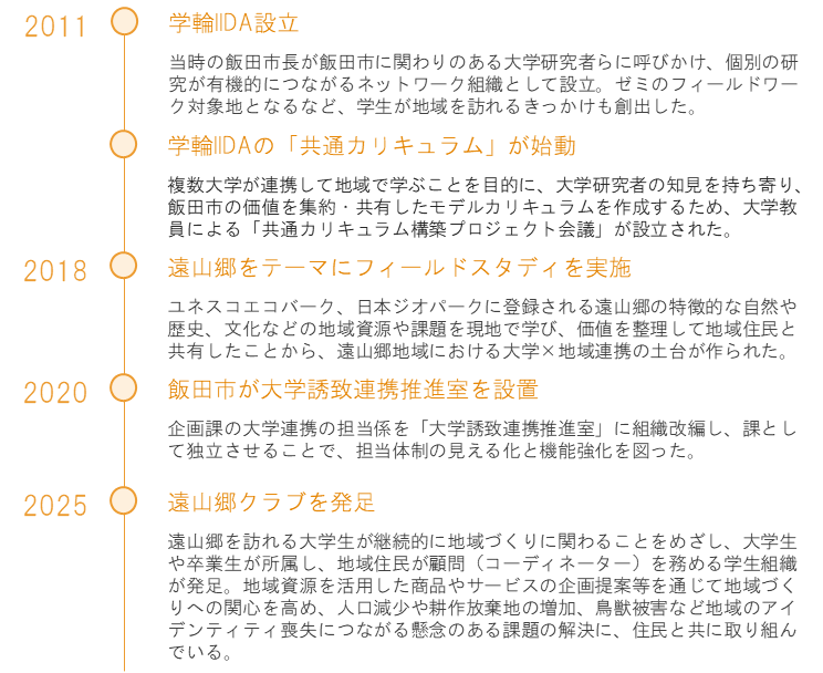 飯田市では、地域に集う研究者による研究成果や学び、そこから生まれる人材交流といった大学の機能を地域内に実装するため、自治体が主導して「ネットワーク型の大学機能」の構築をめざし、大学研究者のネットワーク組織である「学輪IIDA」を設立するとともに、段階的に機能を積み重ねてきました。